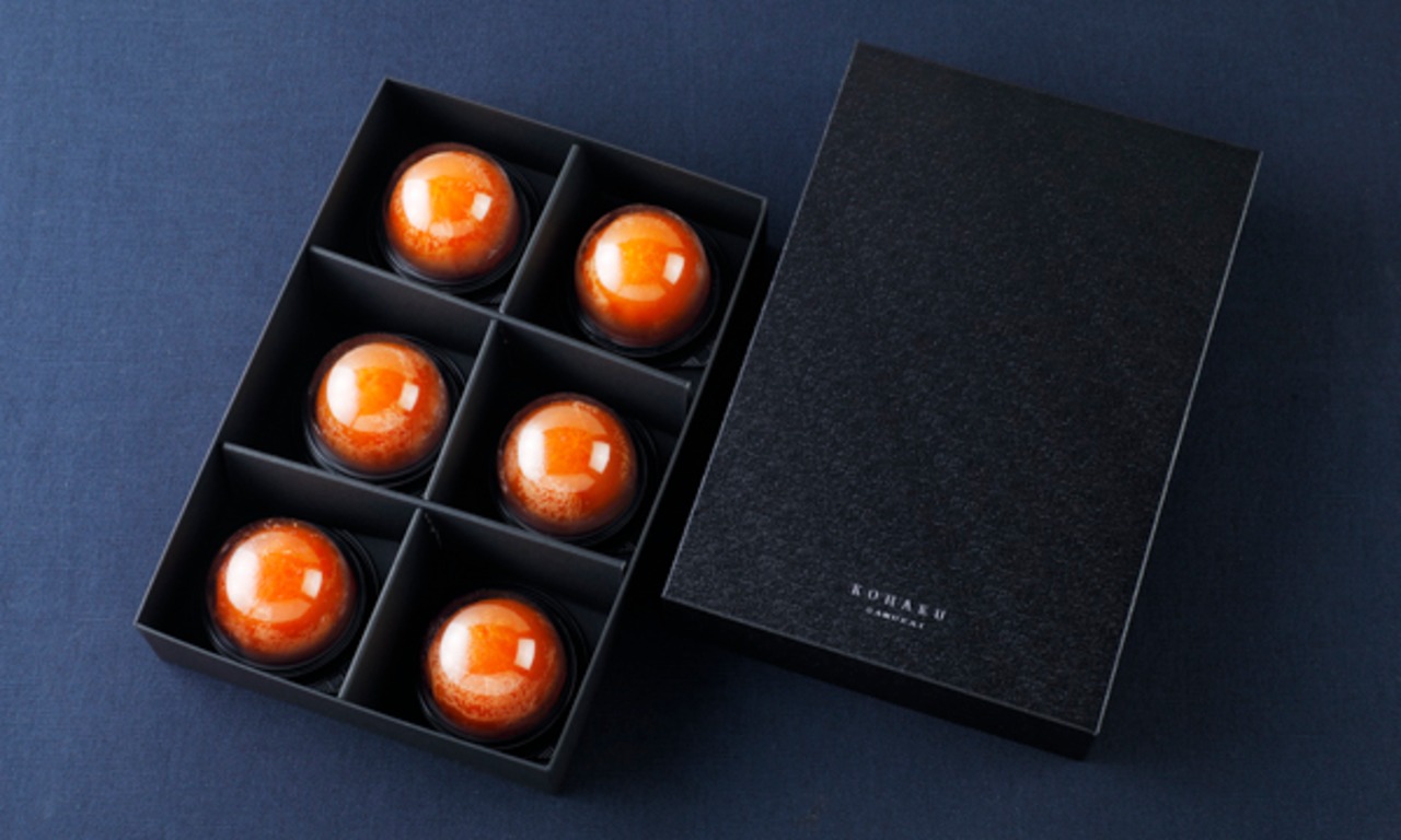 “KOHAKU”は、石川県能登町で収穫された平核無柿(ひらたねなしがき)を使用し、「あんぽ柿」と呼ばれる瑞々しくて甘い干し柿を作り、独自の製法で瞬間凍結しました。